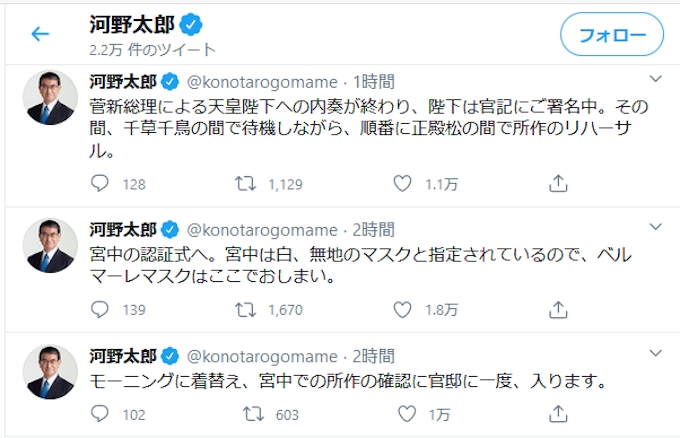 河野太郎氏 入閣を実況中継 呼び込みやマスク交換 日本経済新聞
